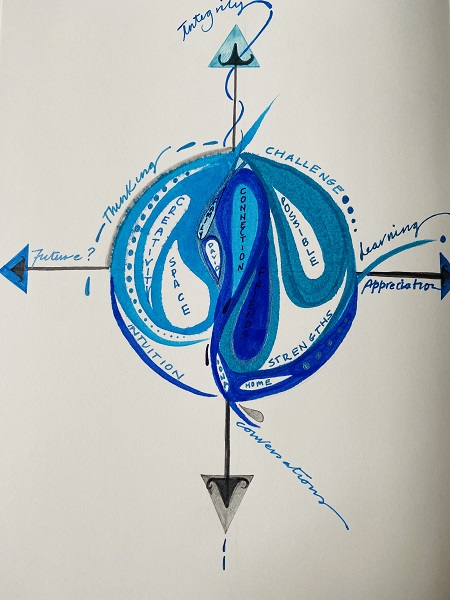 Centrally, the words show my connection to David, my family, my friends, and the Island of Iona (maternal heritage). Without these people and places, I would be adrift. They are at the heart of my compass. The other words inside and outside the circle describe what I think I do with my leadership and how I engage others, on my and their own leadership journey.